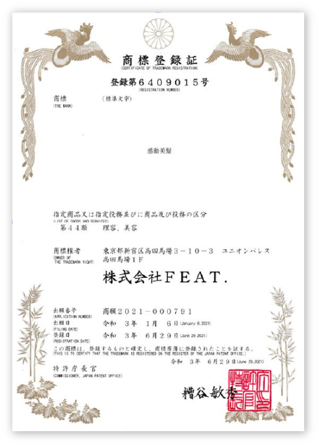 感動美髪サロンFEAT.は、特許庁から正式に商標を認定された日本で唯一の「感動美髪トリートメントサロン」です。